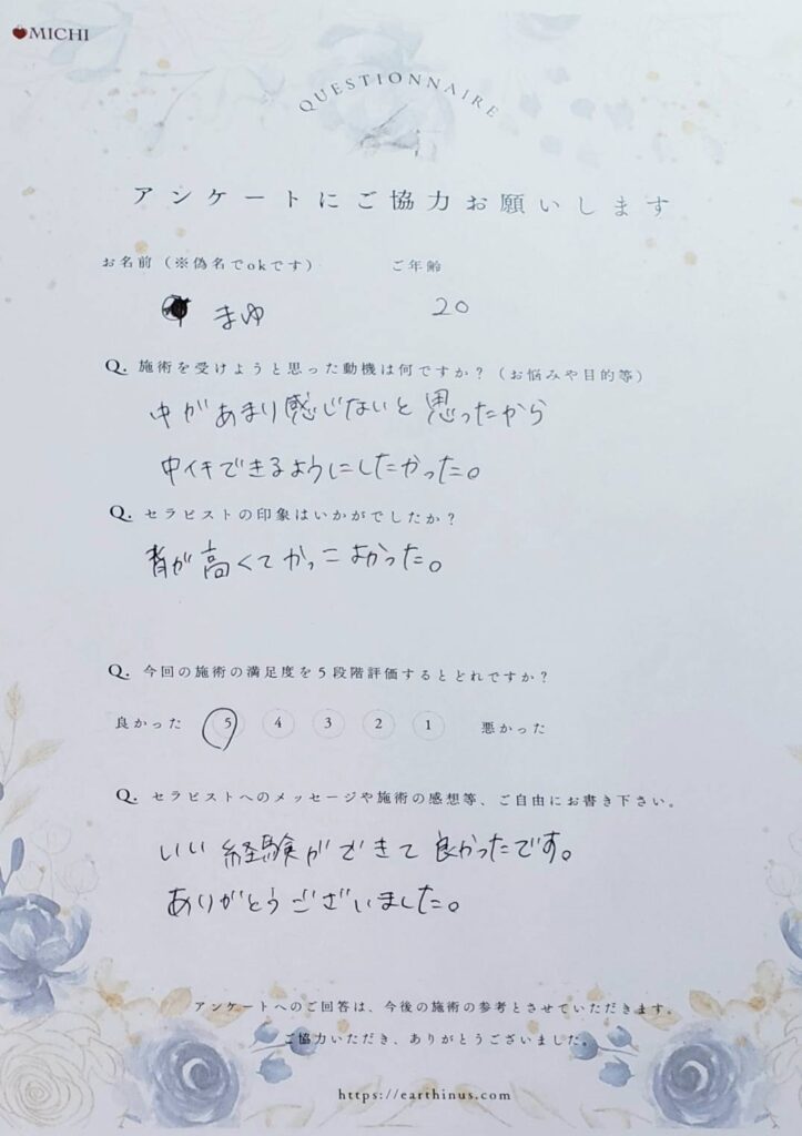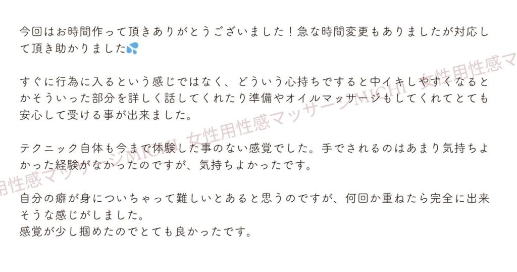すぐに行為に入るという感じではなく、どういう心持ちですると中イキしやすくなるとかそういった部分を詳しく話してくれたり準備やオイルマッサージもしてくれてとても安心して受ける事が出来ました。
