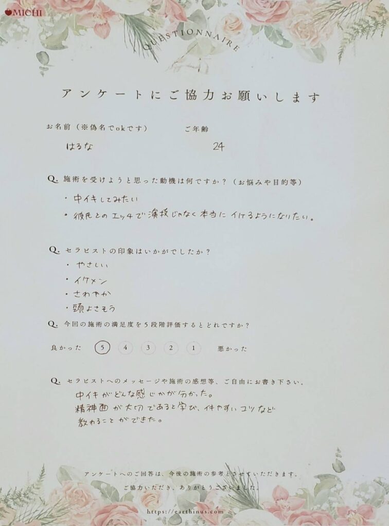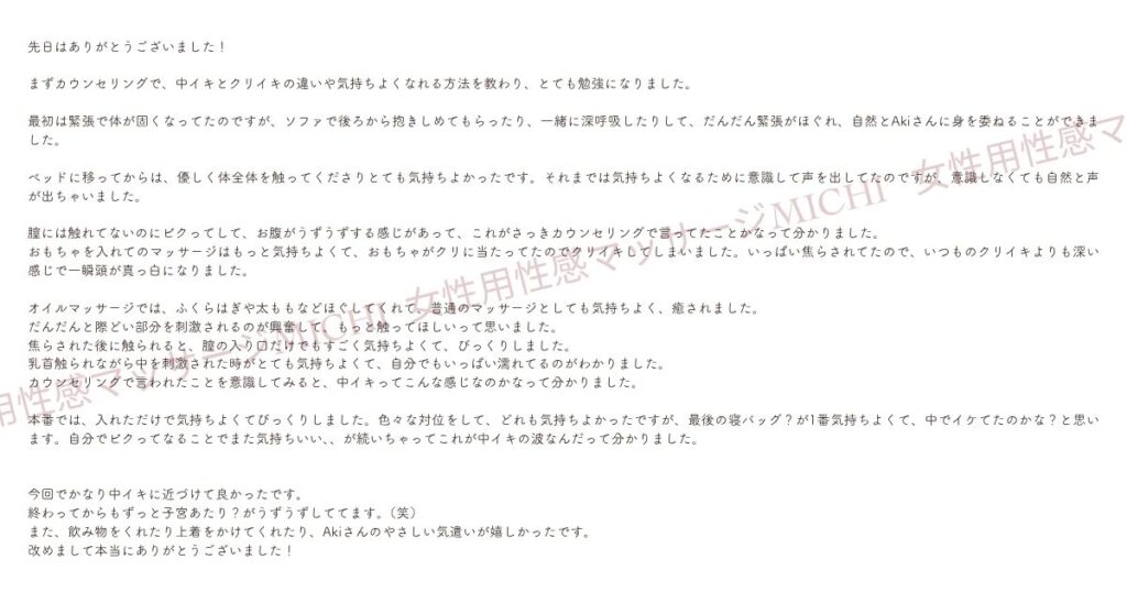 今回で中イキの感覚は掴めたとのことでしたが、まだ伸びしろはありそうです。口コミも長文で書いてくれて満足してくれたようなので良かったです。