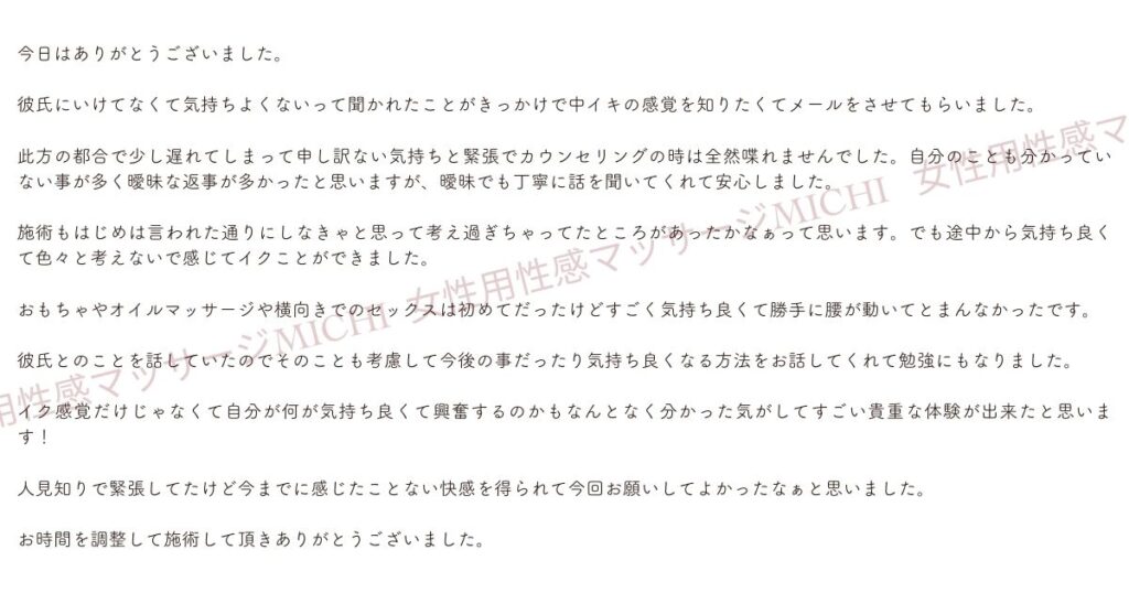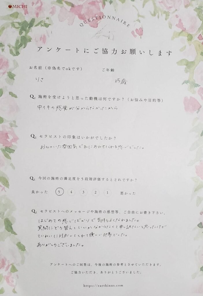 施術もはじめは言われた通りにしなきゃと思って考え過ぎちゃってたところがあったかなぁって思います。でも途中から気持ち良くて色々と考えないで感じてイクことができました。