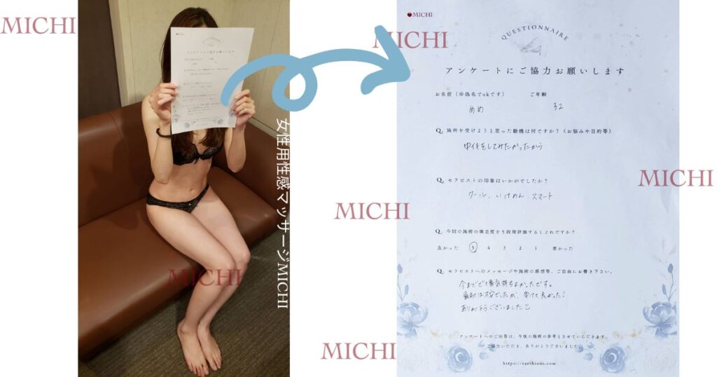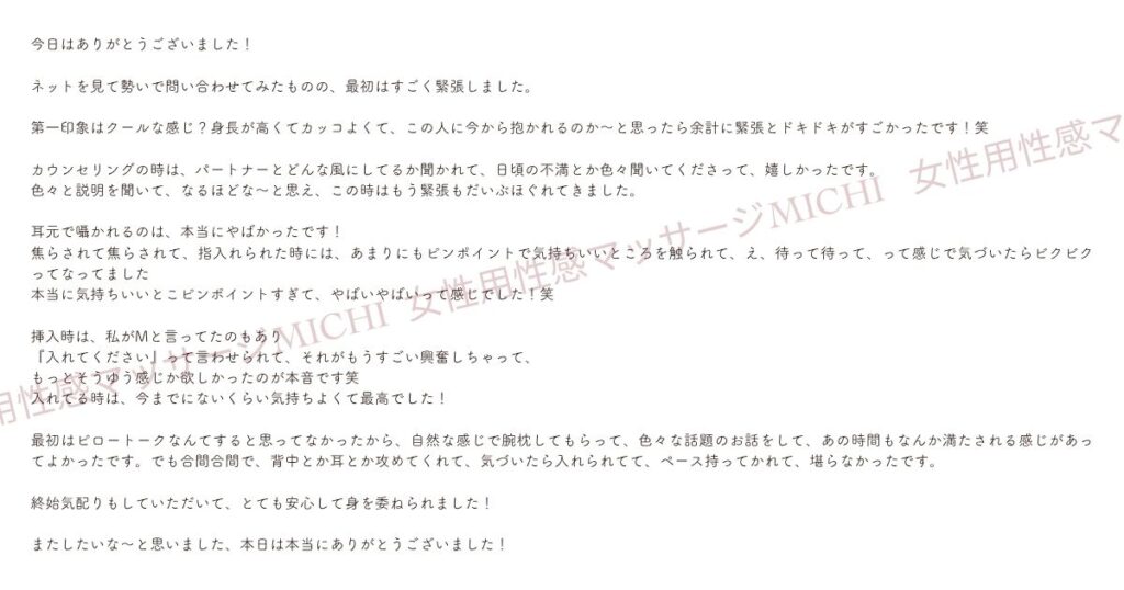 めめさん無いです。 もともと女性用風俗や女性用性感マッサージのお店を探していたわけじゃなくて、なんとなく中イキ関係の情報を見ていて、たまたまサイトを見つけて、記事を読んでいくうちに興味が出てきたので、お酒の勢いもあって予約してみました。