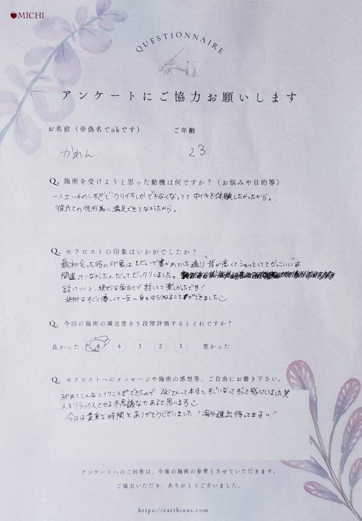 今回の体験者さんは、かれん(23歳/会社員)。応募動機は「中イキがしたくて友達に相談したら女性用風俗の利用をオススメされた。大手女性用風俗店のサイト等も見たけど良さそうな人がいなかった。」とのこと。第一印象は海外から来た明るい可愛い女の子という印象。