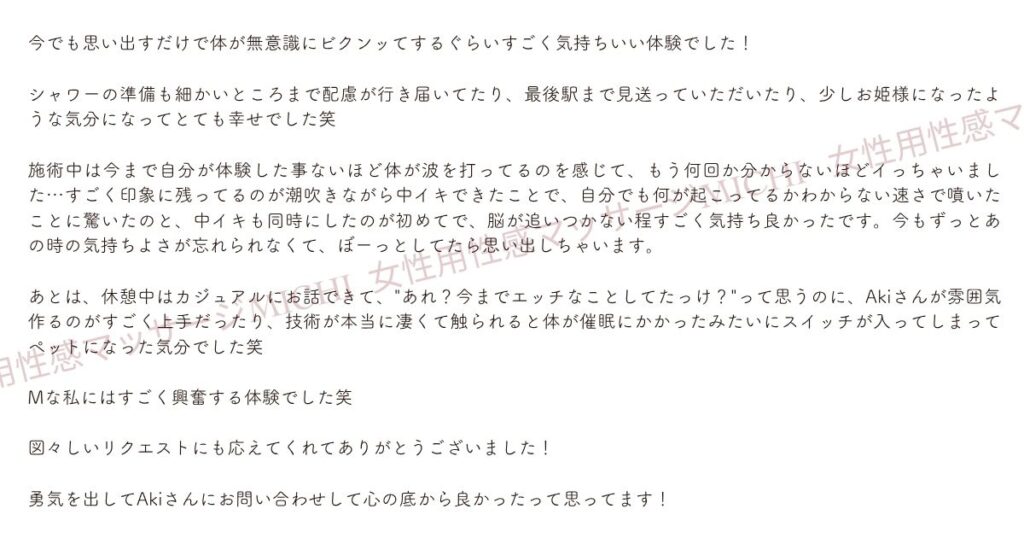 施術中は今まで自分が体験した事ないほど体が波を打ってるのを感じて、もう何回か分からないほどイっちゃいました…すごく印象に残ってるのが潮吹きながら中イキできたことで、自分でも何が起こってるかわからない速さで噴いたことに驚いたのと、中イキも同時にしたのが初めてで、脳が追いつかない程すごく気持ち良かったです。今もずっとあの時の気持ちよさが忘れられなくて、ぼーっとしてたら思い出しちゃいます。