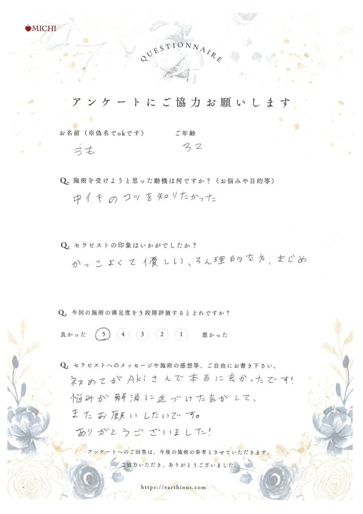 はじめてです。女性用風俗は前から気になっていましたがパートナーがいたのもあり利用していませんでした。今回、萬天堂や東京秘密基地などの女性用風俗のHPも見ましたが、ホストみたいでテクニックがあるかどうか分からなかったので、中イキ開発に特化していてテクニック的にプロっぽいと思ったのでMICHIを選びました。